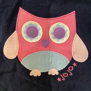 JoJo Maman Bébé Hooded Sweatshirt Owl Applique Reversible Size 0-3 Months. Adorable little hooded sweatshirt, is reversible, one side is navy blue with an applique owl and the other side is pink and navy blue striped. A tag is attached and indicates this piece was a "Salesman Sample" piece. No size tags, washing instructions or material make-up tags. There is also what appears to be some light dye on the owls wings - please see the pictures. Such a cute piece and has never been worn.
