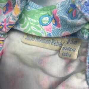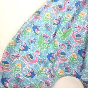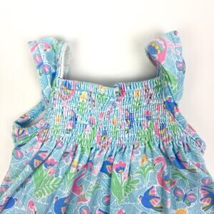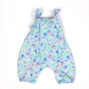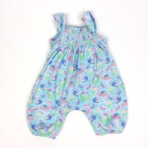 JoJo Maman Bebe Blue Flamingo Jumpsuit. Baby girl size 0-3 months. Light weight one piece romper outfit is perfect for summer! Pool blue with colorful print of birds, flowers, butterflies, and flamingos. Excellent condition.