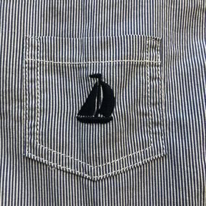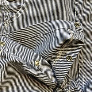 EUC sailboat overalls from JoJo Maman Bebe. Blue and white engineer pinstripe with a blue embroidered sailboat on the chest pocket. Leg snaps for easy on/off, side buttons, and shoulder strap buttons. Lots of pockets: 2 side, 1 chest, and 2 back. 100% cotton. Absolutely adorable and in perfect condition.