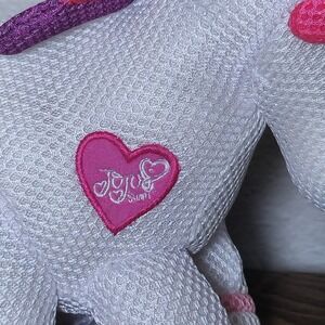 Cuteness overload with this adorable JoJo Siwa unicorn plush! This huggable companion bursts into life with a pristine white body and vibrant rainbow accents adorning its mane, tail, and horn. Notice the delightful pink heart embroidered with 'JoJo Siwa', adding a personal touch of charm. The intricate detailing, from the delicate stitching to the playful pink bows around its legs and on its head, makes this plush a unique treasure. Perfect for snuggling during bedtime stories, adding a pop of color to a playroom, or accompanying a little one on imaginative adventures, this JoJo Siwa unicorn is ready to bring smiles and sparkle wherever it goes.
