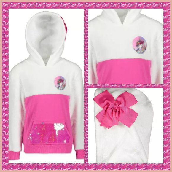 Hoodie features solid bright pink ribbon on left side of hood; Reversible mesh sequin pocket with colors of pink and silver; Lenticular embroidered patch of JoJo's iconic