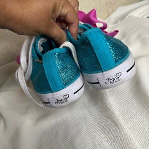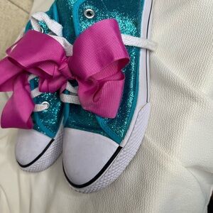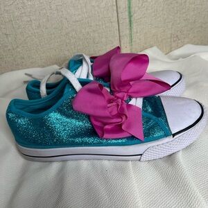 These playful sneakers from JoJo Siwa feature a sparkling blue glitter design complemented by oversized pink satin bows, offering a fun and eye-catching look. The classic canvas sneaker silhouette is enhanced with white rubber toe caps and soles, making them both stylish and comfortable for everyday wear.