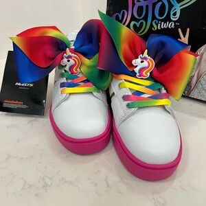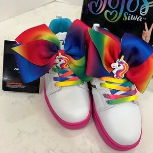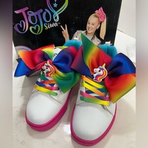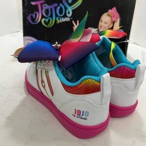 Stylish JoJo Siwa kids shoes. Features a vibrant rainbow bow. White base with pink accents. Perfect for fun outings.