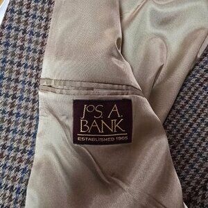 Excellent condition men's JoS. A. Bank pure wool houndstooth 2 button blazer/sports coat. Fabric is 100% pure wool and is houndstooth pattered with tan, dark brown, and grayish blue colors. It has front pockets, a chest pocket, and two inside pockets. Size is 42L.