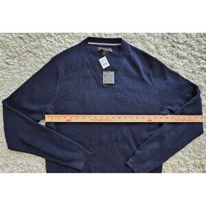 The JoS A. Bank Reserve Men's Large Navy Blue Sweater is a stylish and comfortable addition to any man's wardrobe. Made from a luxurious blend of silk and cotton, this tight-knit sweater features a classic V-neckline and long sleeves, making it perfect for casual occasions during the winter, fall, or spring seasons. The solid navy blue color adds a classic touch, while the button accent adds a subtle detail to the pullover style. This sweater is machine washable and designed for a regular fit, ensuring both comfort and style for the modern man.