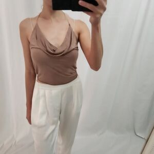 Chic tan crop top with drape neck. Soft and stylish for versatile wear.