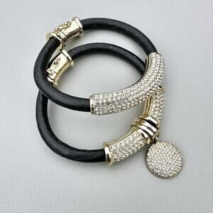 Joan Boyce Set 2 Black Leather Gold Pave Rhinestone Love Barrel-Rolled Bracelets