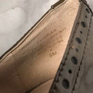 Patent leather brogue style pumps in a dark taupe. Leather soles. 4” heel.