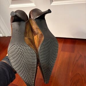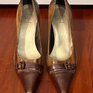 Step out in these classic brown heels from Joan & David, featuring a snakeskin pattern and a stylish buckle accent. Perfect for work or a night out, these shoes offer both comfort and sophistication.