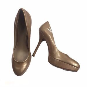 Approx 5” heel with 3/4” platform. Champagne Patent Leather with leather lining and buffed leather sole. Minimal signs of wear. The perfect combination of feminine and sexy! Unique color that translates from a champagne blush to light iridescent pink, with hints of metallic undertones. An amazing "neutral" color. Elegant design. While taking the photos noticed a spot that isn’t visible when wearing. see last photo - spot is under the patent finish.