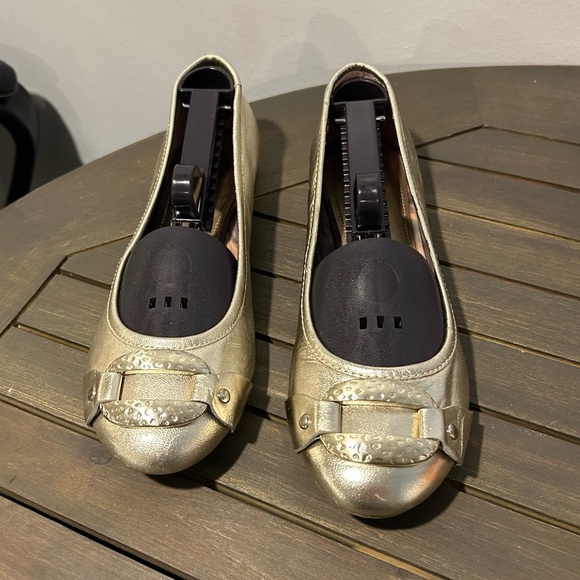 excellent condition, gold with gold dotted buckle at toe, pet/smoke/stain free