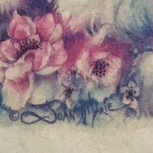 3/$15 Tote bag with Joan Marie art picture on the front. It is a kitten or cat and butterfly and flowers with multicolored background. The bag measures approximately 13.5 inches by 17.5 inches. The handles show a little wear but still in great condition. Clean inside and out.