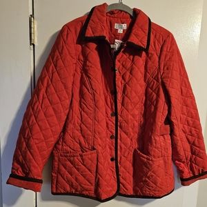 Joan Rivers Quilted Red Barn jacket from the 90s with black trim and gold buttons. The black leather looks like leather but not. This jacket is machine washable. Button Front jacket with a collar. Snaps on the side to make this a more "fitted" jacket. Excellent pre-loved condition