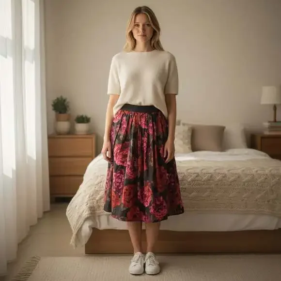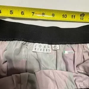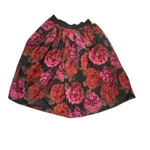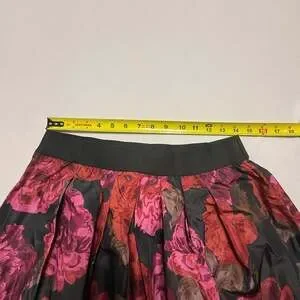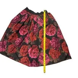 Joan Rivers Floral Midi Skirt, Pink and Red Rose Print, Petite Medium — Elegant and versatile. This beautiful A-line skirt features a bold oversized floral pattern in shades of pink and red on a black background. Design includes a comfortable black elastic waistband and pleated detailing for a full, feminine silhouette. Made from 100% polyester with a smooth finish. Perfect for work, weddings, or casual chic styling. Excellent pre-owned condition with no visible flaws. Machine washable. Measurements: Approximately 30 inches in length with a 15 inch flat-lay waist.