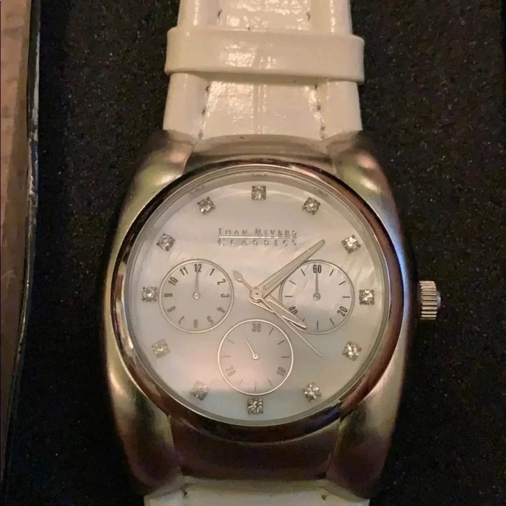 JOAN RIVERS LARGE CLASSIC COLLECTION SILVER WATCH WHITE BAND NEW