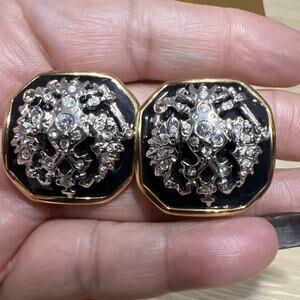 The Joan Rivers Black Silver Double Headed Eagle Clip on Earrings are a stunning and elegant piece of vintage jewelry. These chunky earrings feature a unique double-headed eagle design with a square-shaped crystal as the main stone. The black color and gold tone metal add a touch of sophistication to any outfit, making them a versatile accessory for women who appreciate vintage Elegance style. With the clip-on closure, these earrings are easy to wear and add a statement to any ensemble.