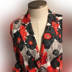 This Joan Rivers Black and Red Floral Jacket Size 10 is in excellent condition and totally adorable. Great with pants or skirt. Great buttons. Pockets. Check out cuffs. Thin snap in removable shoulder pads. Elastic back. With short slit.