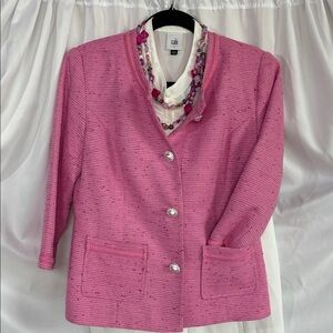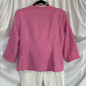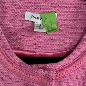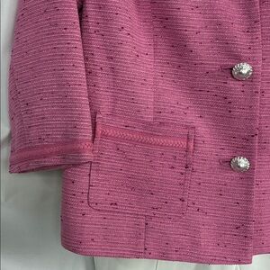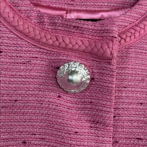 The perfect color pink with silver thread and buttons with braided trim around collar and cuffs.