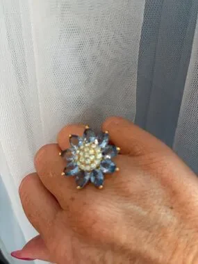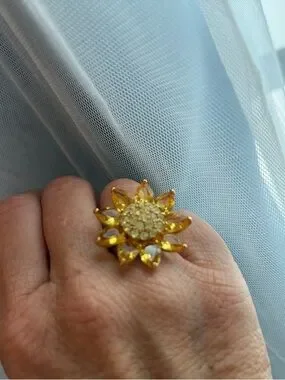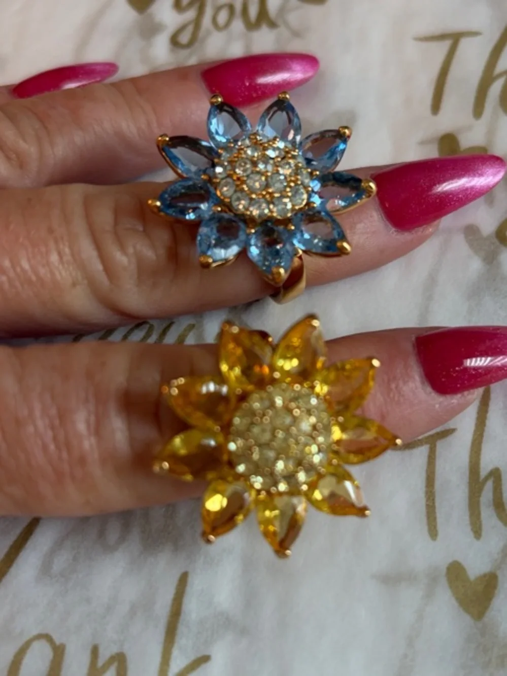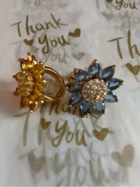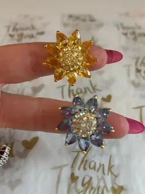 Joan Rivers floral rings with sparkling centers. One ring features yellow crystal petals. The other has blue crystal petals. Both have gold tone metal settings. Eye-catching and feminine duo.