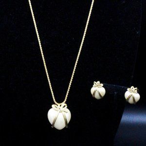 Elevate your jewelry collection with this elegant designer set by Joan Rivers, a testament to her timeless artistry. This set comprises a necklace and a pair of matching earrings, each exuding sophistication and charm. The necklace features a graceful puff heart-shaped pendant, crafted from faux pearls and embraced by delicate gold-tone ribbon detailing adorned with sparkling rhinestones. All pieces are proudly marked with "JOAN RIVERS," a symbol of enduring quality and style. In impeccable mint condition, the 28-inch chain complements the pendant's dimensions of 1 1/2 inches by 1 3/8 inches, while the earrings mirror the pendant's design, measuring 1 inch by 3/4 inch, making this set a timeless and enchanting addition to any fashion enthusiast's collection.