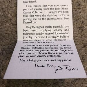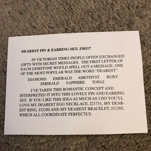 Hard to find Joan Rivers “Dearest” Pin & Earring Set. In Victorian times, people often exchanged gifts with secret messages. The first letter of each gemstone would spell out a message. A popular message was the word “Dearest “: Diamond, Emerald, Amethyst, Ruby, Sapphire, Topaz. BNWT. Beautiful set!