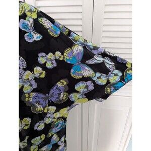 This Joan Rivers dress is a perfect addition to any wardrobe. The butterfly pattern in black, purple, blue, and green colors is eye-catching and perfect for travel, party/cocktail or casual occasions. The dress features a v-neckline, 3/4 sleeves, and a kimono sleeve type, with a pullover closure. It is made of polyester and spandex materials with a jersey fabric type, and is machine washable.