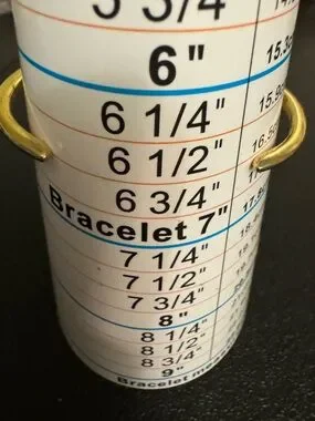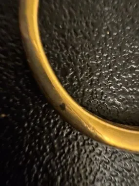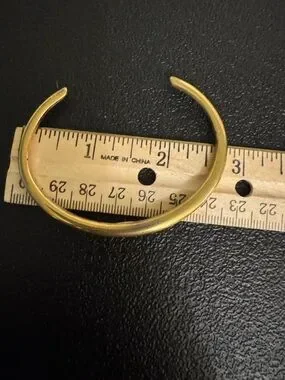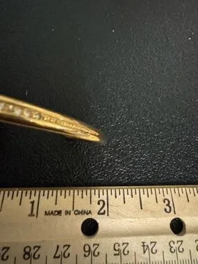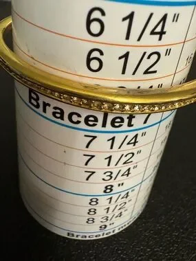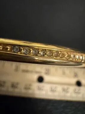 Slim gold-tone bangle with a row of clear rhinestones along the edge. Polished finish with subtle sparkle. Lightweight and easy to stack. Rhinestones appear intact. Small wear mark on gold tone as seen in images. See images for wear and sizing details. Consider bundling for additional savings.