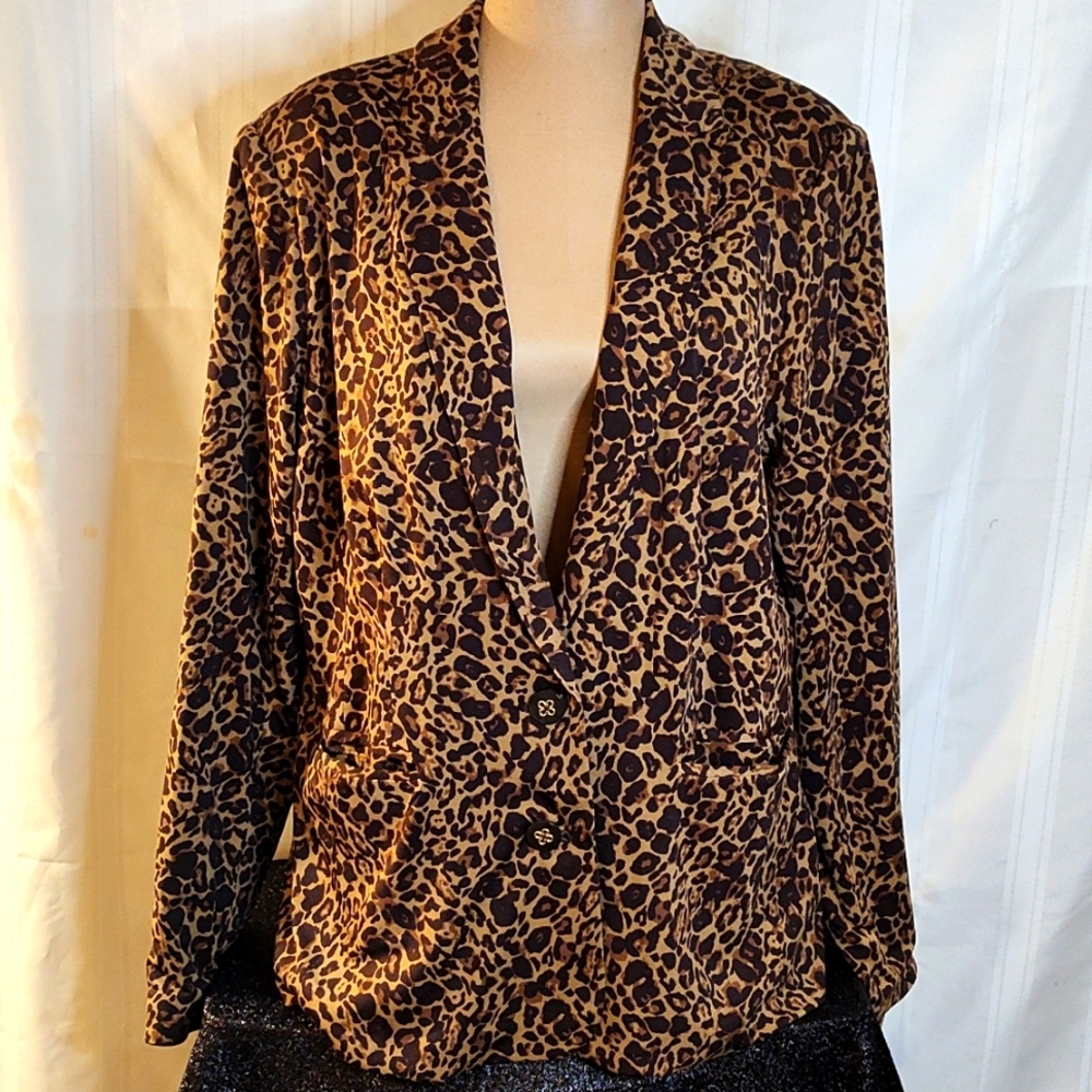 Animal print brown buttons down the front long sleeves with pockets in the front jacket.