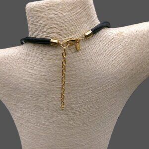 Joan Rivers Black Leather Rope Necklace with Graduated Rings and Additional Pendant. The leather cord broke on the one necklace so I am including it with this necklace. The pendants are hammered gold. The necklace has 3 graduated rings. The leather measures approximately. 15 inches with the pendants extending down and an additional 3 inches. Please view all photos for details and condition. The necklace has never been worn, the additional pendant is used and in good shape.