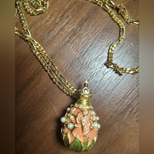 Lily Of The Valley Golden Enamel Egg Pendant Necklace With Pearl Accents By Joan Rivers, 1990s
