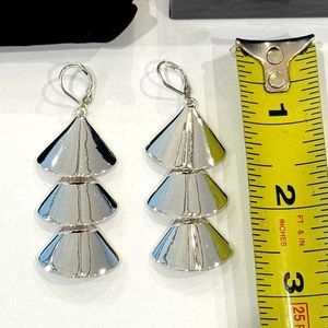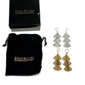 Brand new in box. Vintage Joan River Polished 3 tiered drop dangle earrings. This purchase includes both pairs, silver and gold. Drop lever closure. Measurements roughly 2.5'' x .75'' (Please check pictures for measurements.) Includes original dust bag and box. Rare find in brand new condition.