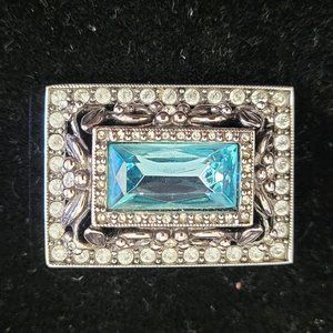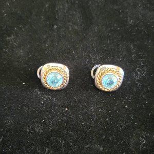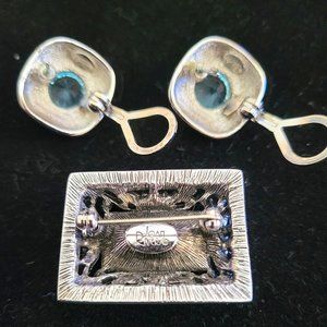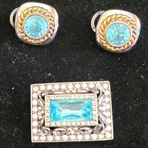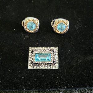 Joan Rivers Collection - Rectangle silver tone brooch has blue & clear rhinestones. The rectangle brooch measures 1" X 1 1/4". The earrings are in a silver tone with a gold rope design around the blue center stones. - Marked Joan Rivers on the back. Earrings are for pierced ear with a clip to hold them in place. All 3 items are in good condition. See all the pictures for more details.