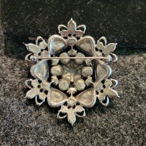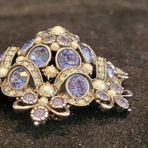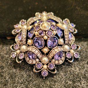 This is a gorgeous 2.5" Joan Rivers dome shape brooch that is in a silver tone. The brooch has purple and clear rhinestones with faux Pearls in a fun and eye catching design. The dome shape brooch measures 2.5" diameter and it is signed on the back as Joan Rivers. This is from her Classic Collection. See all pictures for more details.