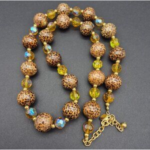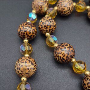 Fabulous necklace featuring AB wash glass beads in yellow amber color, accenting leopard print beads and gold tone spacers. Perfect for adding a bold statement to any outfit, this 33" piece is a versatile accessory for various occasions.