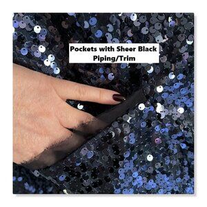 Navy sequins. Sheer piping/trim. Two front pockets. Lined.