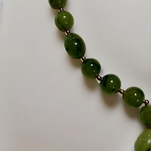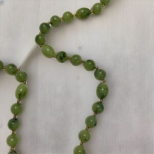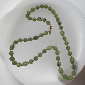Add a touch of boho chic to your outfit with this stunning green jasper necklace. The 30-inch necklace features a lobster clasp closure and is strung with polished semi-precious stones that are sure to catch the eye. The necklace is signed by the designer, Joan Rivers, and is an original piece from the 2000-2009 era.