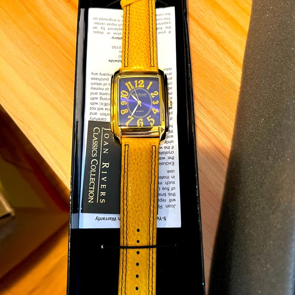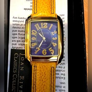 Brand new Joan Rivers Watch gold tone face with mustard color strap brand new in box.