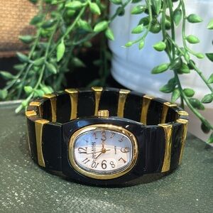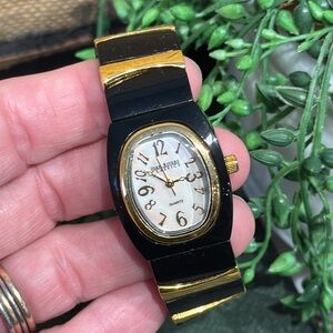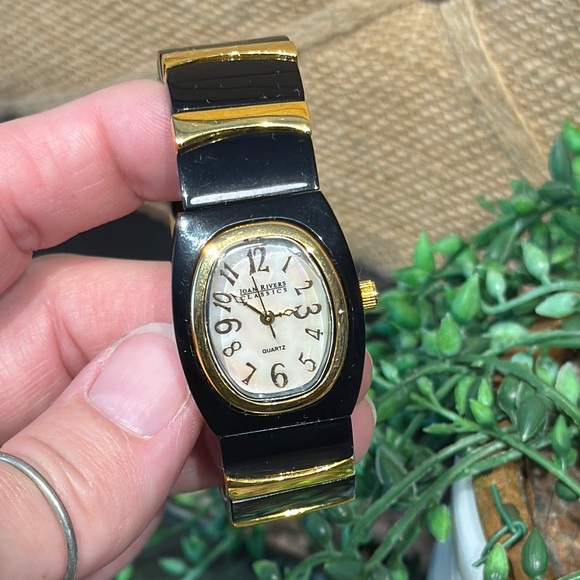 A black and gold stretch band Joan Rivers watch, needs a new battery, 3/4”W band.
