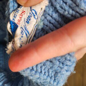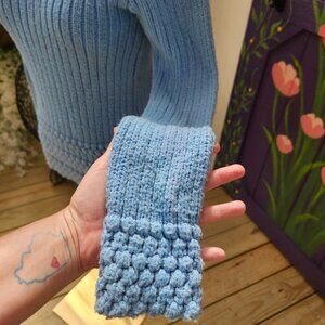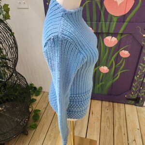 Vintage 1950's - 1960's baby blue knit acrylic sweater by Joan Marie. This is a classic mod 50's/60's fit knitwear sweater with a high neckline and long sleeves. rib knit design with bubble knit at the cuffs and hem. Pullover style with no zippers and closures. Heavyweight 100% Orlon acrylic. Unlined. No shoulder pads.