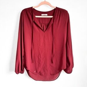 Joan Vass Burgundy Wine V Neck Balloon Sleeve Flowy Blouson Poplin Blouse. Size XS. Excellent condition. Tie neck detail.
