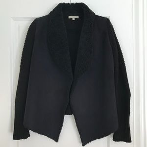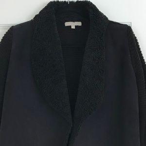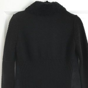 - Combination of faux fur collar and inside lining, suede front draped panels and knit arms and back