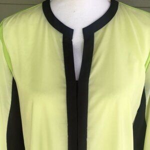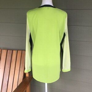 It has a lighter lime green front and a brighter green back. It also has black around the neck and going down the front and the underneath the sleeves.