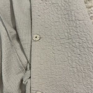 Joan Vass long jacket in very light taupe/grey. Hidden button up.