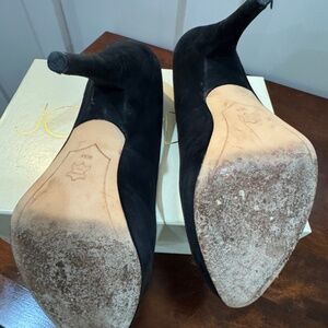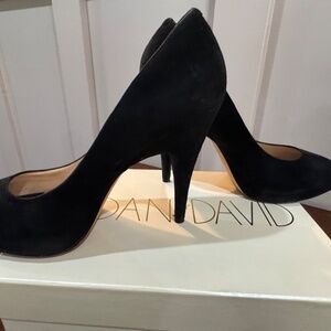 Joan and David DAFELICITA BLACK Suede Platform Heels with patent trim on front toe. great condition, barely worn comes with Box 4" heel. (5" with a 1" platform makes the external heel ~4")