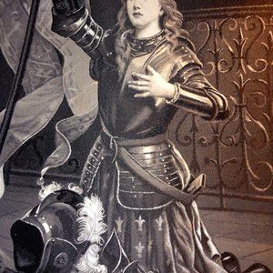 Joan of Arc Embroidery Antique silk tapestry, needlepoint after painting by A. Jacquard / G. Doven edges scotch taped to cardboard, Height 13 inches x Width 8" inches Price: 465.00