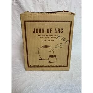 Vintage Joan of Arc French Provincial Oven To Table Service. Includes bean pot, bean pot lid, 6 serving bowls, the original box and original packaging. The exterior is a matte finish with a brown glazed inside and rim. These look barely used. There are a few small cracks that are just on the outside (superficial) of the bean pot that don’t go entirely through the pottery. The lid has some scratches and staining as pictured. The box shows wear. Made in the USA. A few of the pieces have a splatter like stain. I have taken several pictures so please review closely to get an accurate depiction of condition. Please take into account when assessing price that I will be paying a substantial amount extra for shipping, as this item is 8lbs 5oz.