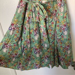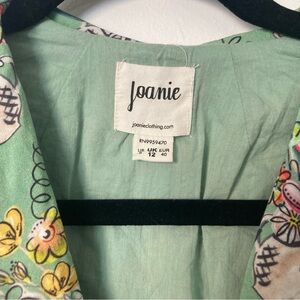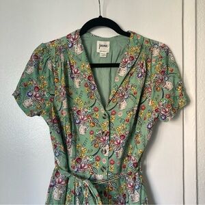 Adorable retro style summer dress by UK brand Joanie, adorable and well made! This vintage-inspired day dress boasts a retro roll collar and V-neckline leading to a button-through front, short sleeves, a sash tie belt at the waist, and pockets at the hip. Adorable print and flattering color. Well lined and had pockets!! Falls above the knee on me at 5’9” (I included a picture from the website of a similarly styled dress that shows the fit/length on a model)