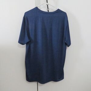 This comfy men's dark blue jersey v-neck shirt is perfect for many kinds of activities, including travel and outdoor activities. It is a size large. It is made of polyester and spandex and is wrinkle resistant. It looks great with jeans, khakis, or shorts. It's perfect for Spring Break, a cruise, or other casual wear!