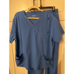 Jockey Men’s Scrub Set in classic blue. The set includes a size Large top and Medium cargo scrub pants, designed for all-day wear.