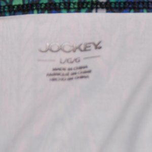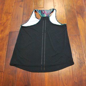 Jockey workout tank top with a multi-colored print front, black back, and white interior. Moisture wicking and very comfortable while working out.